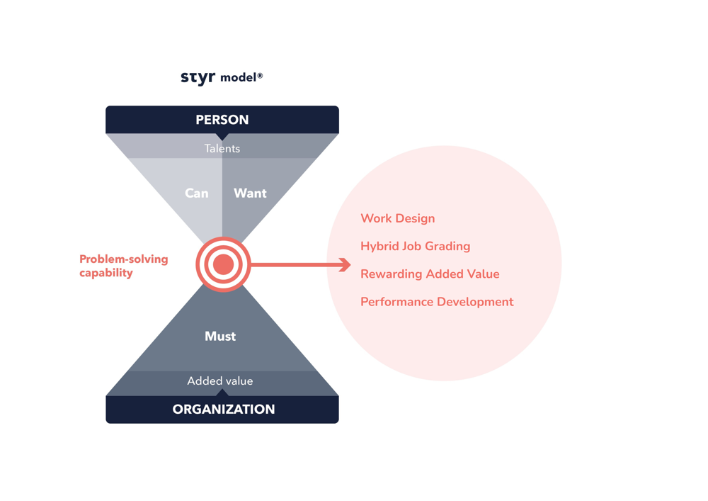 The Styr model is a hybrid job grading model that is unique in its approach. It focuses not only on the expectations of the organization (the work you must do), but also on what people want and can. The focus here is on the problem-solving capabilities needed and the talents and competences it takes to do the job well.